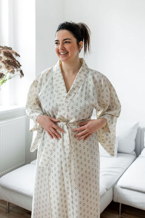 Naše modely se neřídí klasickými konfekčními velikostmi. Díky zavinovacím střihům se přizpůsobí postavě i jejím proměnám. Řídit se můžete mírami v úvodu každého modelu – a pokud si nejste jistý/á , rády vám model upravíme/ušijeme na míru.